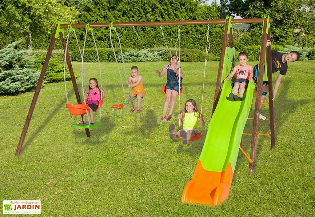 Les balançoires sont soufflées. La plateforme du toboggan se situe à 1,20 m du sol. Elle est en résine et équipée de garde-corps. Le toboggan possède une longueur de glisse de 2,63 m. La nacelle possède des sièges confortables. Le face-à-face est ergonomique et limite les chocs. Le diamètre des pieds et de la poutre est de 80 mm. Attention il est nécessaire de sceller le portique dans du béton avec les pattes de scellement fournies. La garantie est de 10 ans sur la structure en bois contre les attaques de champignons et d’insectes, de 10 ans contre la perforation et de 2 ans sur les pièces en plastique.