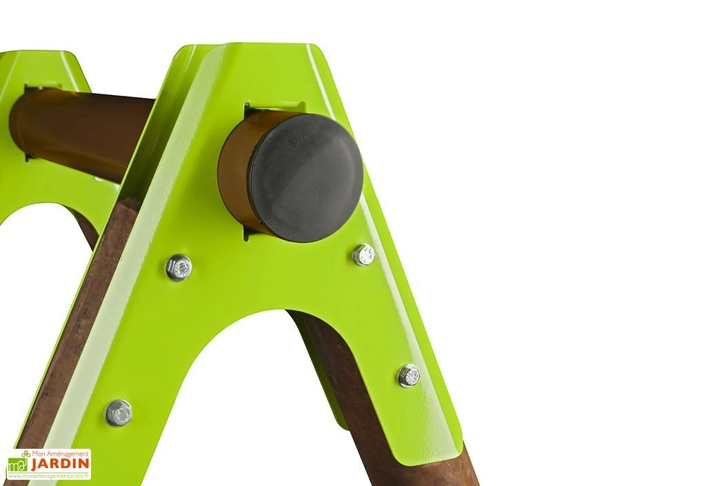Ce portique Trigano est fabriqué en France. Il est conçu en bois et en métal et est doté de pieds en pin traité autoclave classe 4. Votre portique ne nécessitera donc aucun entretien particulier puisque le bois utilisé est protégé contre les intempéries, les insectes et autres champignons susceptibles de le détériorer. Sa poutre principale est fabriquée en métal compact et est composée de plusieurs parties, renforçant ainsi sa solidité. Notez enfin qu’afin de garantir à vos enfants une sécurité totale, ce portique devra être impérativement scellé dans du béton afin d’éviter tout risque de basculement durant son utilisation.