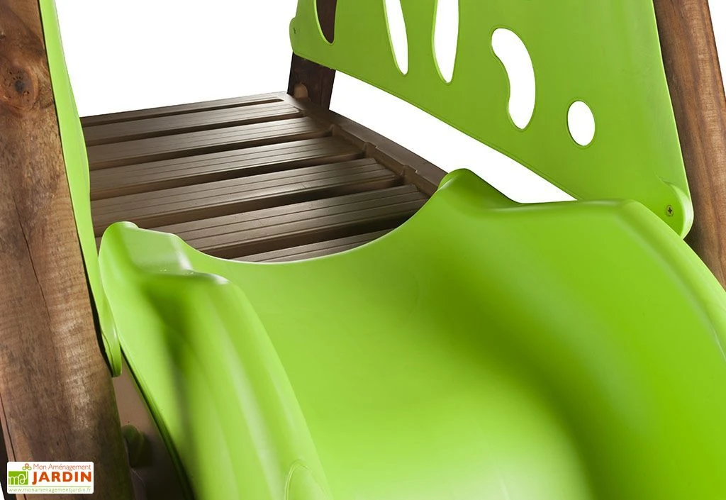 Très complet, le portique comprend deux balançoires, un face-à-face, une échelle de corde avec barreaux en bois, un trapèze anneaux et un toboggan de 2,63 m de long. Ce dernier est rattaché à une plate-forme située à 1,20 m de hauteur accessible grâce à une petite échelle et protégée par deux garde-corps. Ce portique affiche des dimensions de 3,60 x 4,62 m, pour 2,30 m de hauteur et pourra accueillir jusqu’à huit enfants (de 3 à 12 ans).