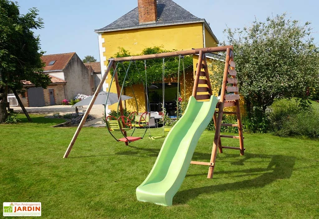 Le portique pour enfants est fabriqué en bois traité autoclave classe 4 qui résiste aux intempéries, à la moisissure et aux insectes. Ce bois est également certifié FSC, ce qui signifie qu’il provient de forêts gérées durablement.