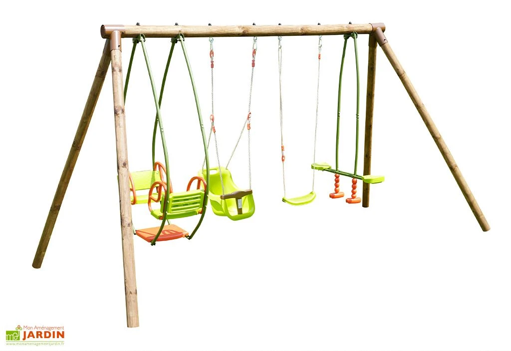 Le portique en bois est conçu pour accueillir 6 enfants âgés de 3 à 12 ans. Il mesure 3,77 x 1,89 x 2,22 m et est équipé d’une balancelle et d’une face-à-face pouvant supporter respectivement 70 kg maximum ainsi que d’une balançoire pouvant supporter 50 kg maximum. Il y a également un siège pour bébé (15 kg maximum) avec ceinture pour les enfants de 6 à 24 mois.