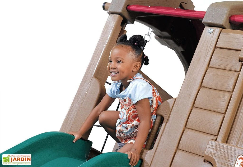 Le centre d’activités comprend également une échelle de corde, des fenêtres, un escalier, une petite porte, un panier de basket et un volant de bateau pirate. La toiture de la cabane est en toile.