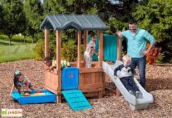 Les grandes dimensions de la cabane permettent à plusieurs enfants, à partir de 2 ans, de jouer en même temps. Un grand soin est apporté à tous les détails en offrant des décors réalistes grâce aux effets de pierres apparentes.