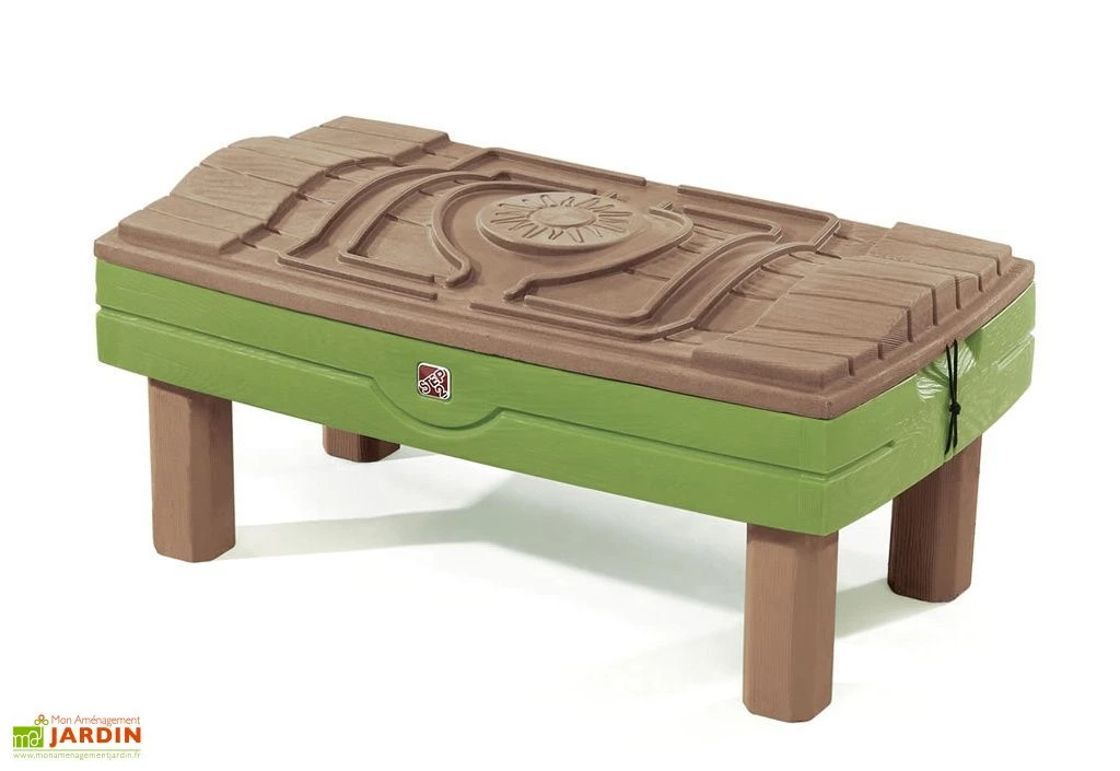 La table de jeu sable et eau est de la couleur verte et marron pour se confondre parfaitement dans le jardin. La composition de la table est en plastique roto-moulé, résistant aux températures extrêmes et aux rayons UV. Ce centre d’activités est garanti 3 ans.