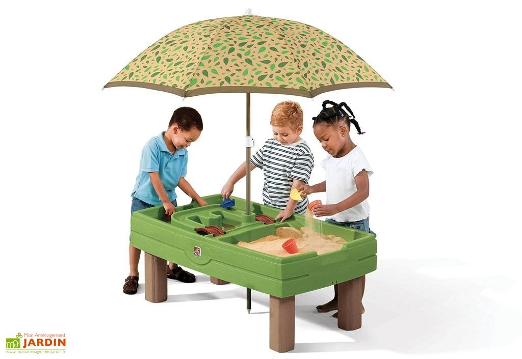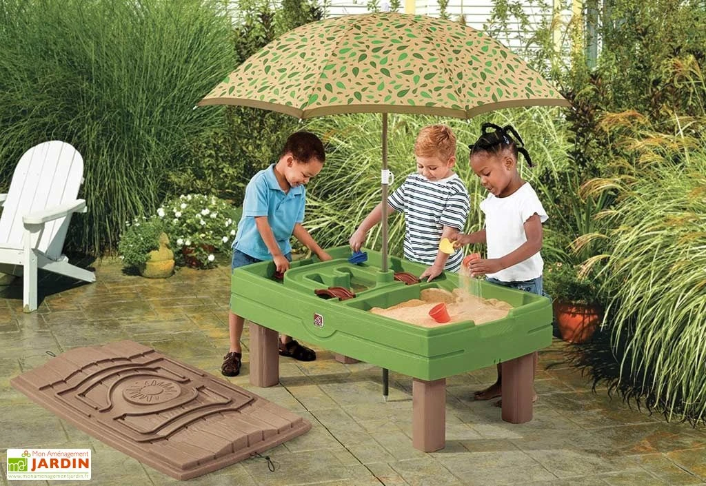 Le centre de jeu pour jardin inclus également un parasol qui s’intègre au milieu de la table afin de protéger les enfants du soleil en pleine après-midi. Il y a également un couvercle afin de préserver la table de jeu toute l’année. Des élastiques sont présents afin de bien le fixer. Le dessus du couvercle est constitué d’un moulage représentant un circuit automobile pour jouer avec des petites voitures.