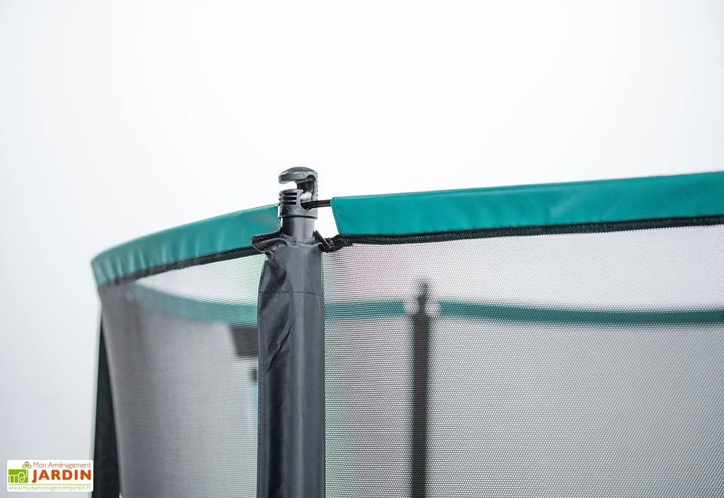 Afin d’assurer la sécurité de tous, ce trampoline de jardin s’est vu doté d’un filet en polyester de 1,80 m de haut fermement maintenu par dix poteaux qui contribueront de plus à la bonne stabilité de l’ensemble puisqu’ils ne s’arrêtent pas à la surface de saut, mais descendent jusqu’au sol. Les ressorts sont pour leur part recouverts d’un coussin de protection de 3 cm d’épaisseur, rembourré de mousse et revêtu de PVC traité anti-UV, permettant d’éviter tout risque de blessure au niveau des pieds.