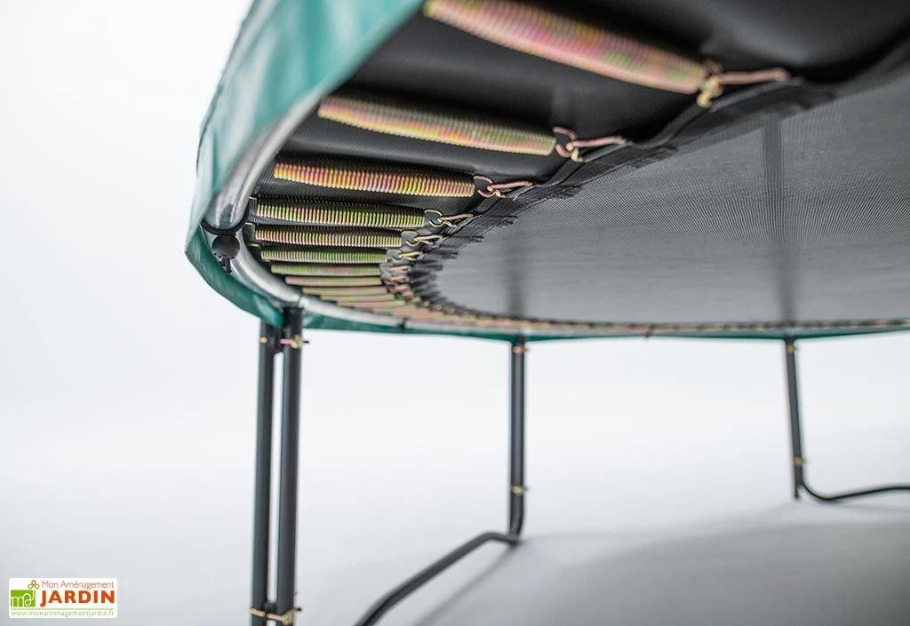 Ce trampoline d’extérieur est équipé d’un tapis de saut de 4,35 m de diamètre qui, de par sa conception plus aérée, permet de réaliser des sauts bien hauts ! Fabriqué en mesh, un textile très résistant, ce tapis de saut est également renforcé sur tout son pourtour et repose sur 120 ressorts de 210 mm de long. Ces derniers garantissent un rebond dynamique et offrent une meilleure amplitude de saut, ce qui est idéal pour tenter des figures !