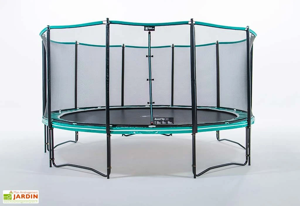 Conçu pour les enfants comme pour les adultes, le trampoline sur pieds Boost’Up 490 de chez France Trampoline possède une solide structure de 4,88 m de diamètre et dispose d’un tapis de saut qui pourra supporter un poids maximum de 120 kg. Robuste et résistante aux intempéries, l’armature du trampoline est fabriquée en acier galvanisé à chaud, ce qui signifie qu’elle ne craindra ni l’humidité, ni la rouille, et ce sans exiger d’entretien particulier. Ce trampoline rond pourra dès lors passer l’hiver dehors tout en témoignant d’une belle longévité.