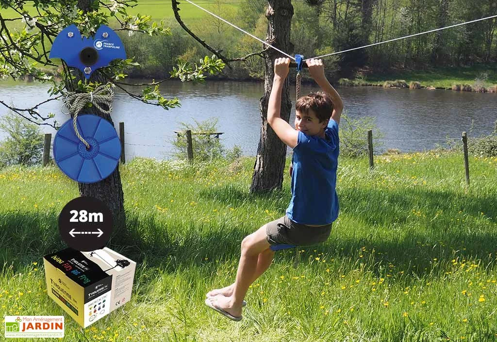 Vous pourrez donc ajuster la hauteur et la longueur de la tyrolienne selon la taille de votre jardin et l’emplacement des arbres servant de points de départ et d’arrivée, en tenant compte de la longueur du câble qui est de 28 m. Les arbres choisis devront être en bonne santé et posséder une circonférence maximale de 188 cm pour l’arbre de départ, et de 92 cm pour l’arbre d’arrivée (soit un diamètre compris entre 30/60 cm et 30/40 cm).
