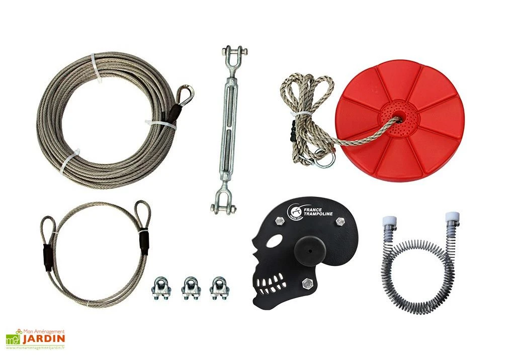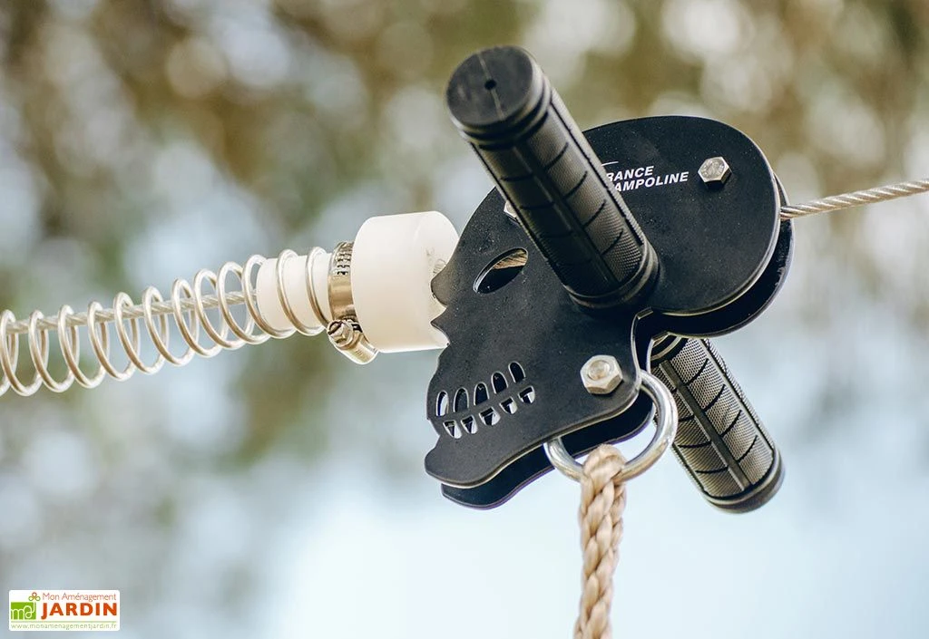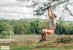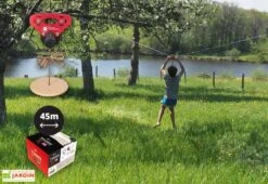Cette tyrolienne de jardin est facile à installer. Elle mesure 28 m de long et devra être tendue entre deux arbres solides dont les circonférences ne devront pas dépasser les 188 cm pour l’arbre de départ et 92 cm pour l’arbre d’arrivée (soit des diamètres compris entre 30 et 60 cm pour le premier et entre 30 et 40 cm pour le second). Notez qu’afin d’éviter tout risque de blessure en cas de chute, il est conseillé d’installer la tyrolienne au-dessus d’un sol mou (sable, herbe…).